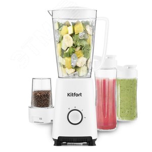 Готовьте всё, что хочется! Блендер Kitfort КТ-1380 сочетает в себе функции двух устройств - стационарный блендер с двумя портативными стаканами, а также кофемолка. Блендер подходит для смешивания фруктовых напитков, приготовления смузи, молочных коктейлей, супов-пюре. В ритме современной жизни. После приготовления вашего любимого напитка нет необходимости переливать содержимое! Бутылка закручивается специальной флип-крышкой, что удобно для хранения и переноски. Вы можете взять бутылку с собой куда угодно. Удобное и простое управление. Управление блендером осуществляется с помощью ручки регулировки скорости на передней панели. У блендера 2 скорости и импульсный режим. 4-лезвийный нож. Блендер оснащён прочным 4-лезвийным ножом из нержавеющей стали с оптимальной формой лезвий и заточки для эффективного измельчения продуктов.