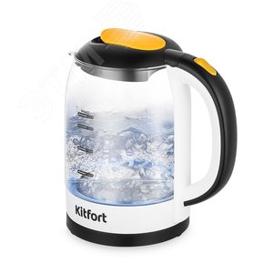Электрический чайник Kitfort КТ-6636 предназначен для кипячения воды дома, в офисе, на даче. Корпус чайника выполнен из стекла, а крышка — из пластика. Ручка чайника пластиковая, не нагревается и удобно лежит в руке. Нагревательный элемент у КТ-6636 скрыт в донной части. Сверху он закрыт пластиной из нержавеющей стали, что препятствует образованию накипи, облегчает уход и значительно снижает шум при нагревании воды. Мерная шкала находится на лицевой стороне корпуса. Кнопка включения расположена на ручке чайника. При включении чайника загорается подсветка на внутренней стороне корпуса под ручкой, которая является индикатором работы и подсвечивает воду в приборе. При закипании воды образующийся пар попадает в паропровод, проходит по нему и затем воздействует на термодатчик, который отключает чайник. Снизу подставки имеется отсек для хранения шнура.