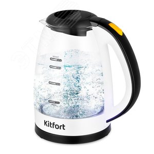 Электрический чайник Kitfort КТ-6637 предназначен для кипячения воды дома, в офисе, на даче. Ёмкость чайника составляет 1,7 л. Прибор имеет защиту от перегрева и от включения без воды - при включении без воды чайник нагревается и отключается (срабатывает защита от перегрева). Чайник имеет широко открывающуюся крышку и большое горлышко, что облегчает доступ внутрь чайника при его чистке и во время удаления накипи. При включении чайника загорается подсветка на внутренней стороне корпуса под ручкой, которая является индикатором работы и подсвечивает воду в приборе. Нагревательный элемент у чайника в донной части. Сверху он закрыт пластиной из нержавеющей стали, что препятствует образованию накипи, облегчает уход и значительно снижает шум при нагревании воды. Мерная шкала находится на лицевой стороне корпуса. Снизу подставки имеется отсек для хранения шнура.