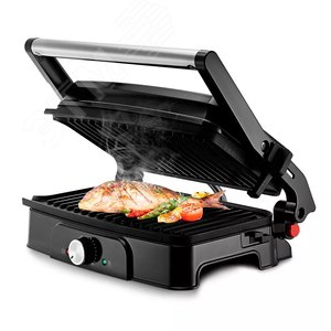 Электрогриль КТ-1659 предназначен для приготовления мяса, рыбы, овощей, сосисок, бутербродов, сэндвичей, гренок, тостов! 3 режима работы - двусторонний, с приоткрытой крышкой, односторонний. Верхняя нагреваемая панель может опускаться не до конца, что полезно при готовке продуктов, которые могут потерять форму из-за давления крышки. Также панель откидывается на 180 , и гриль превращается в жаровню, а продукты выкладываются сразу на 2 панели. С такой конструкцией нагрев и передача t на поверхность происходит эффективнее, и время прогрева и приготовления сокращается. Панели алюминиевые с антипригарным покрытием – идеально для приготовления продуктов с минимальным количеством масла. Электрогриль оснащён термостатом для поддержания постоянной температуры панелей и индикаторами, показывающими наличие питания, а также включение и отключение нагрева.