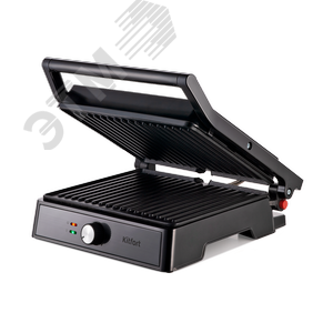 Электрогриль КТ-1699 предназначен для приготовления разнообразных блюд, включая мясо, рыбу, овощи, сосиски, сэндвичи, гренки и тосты! Высокая температура способствует быстрому приготовлению, а ребристая поверхность – появлению ''полосатого'' рисунка. Удобное управление. Регулятор температуры – это ручка термостата. Термостат обеспечивает плавность регулировки, а также функцию поддержания температуры. Вокруг регулятора нанесена шкала - min температура (50–100 С) соответствует началу шкалы, max (220–240 С) — концу шкалы. Режим барбекю 180 С помощью КТ-1699 вы можете готовить как в двухстороннем, так и в одностороннем режиме. В одностороннем режиме крышка гриля откидывается на 180 , и гриль превращается в большую жаровню. Для приготовления можно использовать обе поверхности. Съёмный поддон для сбора жира