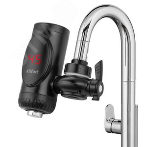 Проточный нагреватель КТ-4034 - это смеситель, предназначенный для быстрого нагрева холодной проточной воды. В корпусе установлен ТЭН, который быстро нагревает воду, проходящую через устройство. Отличительной особенностью проточных водонагревателей является постоянство t С воды. t С нагрева регулируется напором воды - чем меньше напор, тем выше t С. На корпусе устройства расположен дисплей, который отображает текущую температуру горячей воды. Прибор крепится на изливе смесителя с помощью муфт, которые идут в комплекте. Аэратор насыщает воду кислородом, что способствует выветриванию хлора, также это помогает снизить уровень шума потока воды за счёт смешивания его с воздухом и экономит расход воды. Сбоку на корпусе водонагревателя находится отверстие для слива воды с крышкой, которое необходимо, чтобы слить остатки воды из устройства перед хранением.