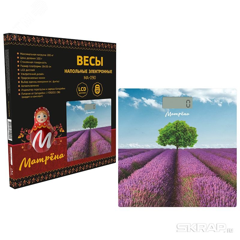 Весы напольные электронные МА-090, рисунок ''Лаванда'', стеклянная поверхность, до 180 кг