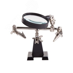 Держатель 'третья рука' с лупой х2.5 REXANT служит, главным образом, при проведении паяльно-сборочных работ в электронике, ювелирном деле, сборке и ремонте для зажима мелких деталей в любом нужном положении, когда не хватает двух рук. . Инструмент состоит из чугунного основания (тяжелая подставка), шарнирного соединения с зажимами типа ''крокодил'' (подвижных во всех плоскостях) с никелевым покрытием и лупы с 2.5 кратным увеличением (возможность регулировки положения, диаметр линзы 60 мм). С помощью лупы можно будет рассмотреть даже самые мелкие детали.