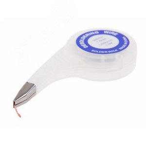 Медная лента для удаления припоя представляет собой плетёную из тонкой медной проволоки оплётку, покрытую специальным безотмывным флюсом. Такая медная лента применяется для удаления припоя с печатных плат при ремонтных работах. После её применения отпадает необходимость в чистке контактных площадок платы и контактов радиодеталей. Удобный бокс сделает использование ленты более комфортным. Порядок работы - Прислоняем медную оплетку к поверхности припоя. Разогретым паяльником размягчаем излишний припой. Мягкоплавкий металл впитывается в оплетку. Диаметр ленты - 3.0 мм. Длина ленты - 1.5 м. Это наиболее эффективный и часто применяемый способ удаления излишков припоя.