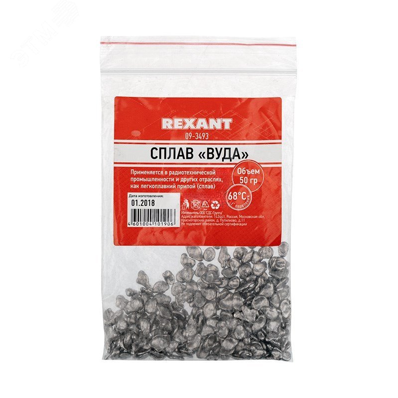 Сплав ВУДА REXANT - гранулы 50 г применяется в радиотехнической промышленности и других отраслях, как легкопайкий припой (сплав).Температура плавления +68 градусов. Представляет собой небольшие гранулы серебристого цвета. Преимущества сплава Вуда-одна из самых низких температур плавления, которая ниже ста градусов Цельсия, что позволяет применять для чувствительных к температуре деталей. Является незаменимым для многих сфер. Доступный сплав, который имеет широкое распространение. Не допускать попадания на кожу (может вызвать аллергию). Хранить в плотно упакованной таре. Работать в хорошо проветриваемых/вентилируемых помещениях, в соответствующих средствах личной защиты.