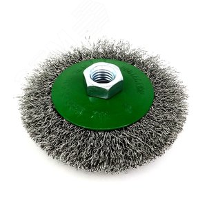 Щетки конические разного диаметра (100 мм) с посадкой М14 на УШМ (Болгарка) с гофрированным (волнистым) ворсом с латунным напылением предназначены для средней тяжести зачистных работ по изделиям из черной стали. Используются в основном для различных стальных изделий для работы в труднодоступных местах, стыках, переходах поверхностей. Обрабатываемый материал - камень, бетон, сталь, черная сталь. Электроинструменты / станки - для УШМ (болгарка) / на 115 мм и более. Диаметр D, Д (мм) - 100. Размер A, E (мм) - 15. Размер T, S (мм) - 20. Посадочный диаметр B, G, F (мм) - М14 (шаг 2,00). Материал ворса щетки - сталь нержавеющая. Диаметр ворса (мм) - 0,30. Тип (форма) ворса - гофрированный (волнистый). Максимальная скорость (об/мин) - 12500.