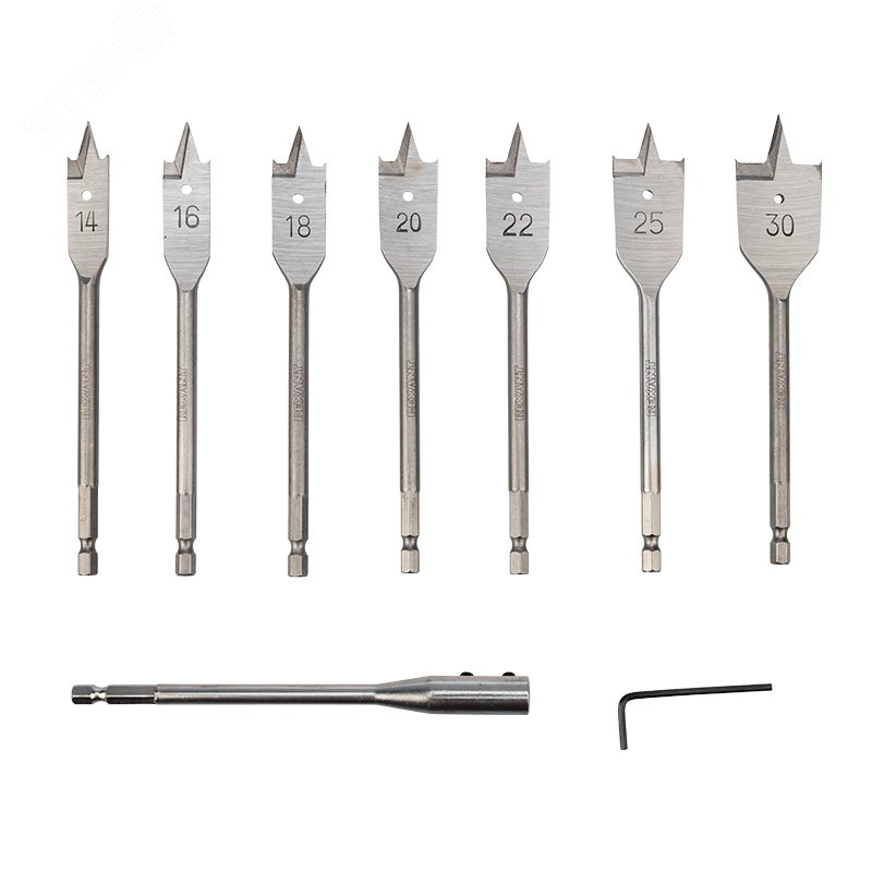Набор сверл перовых по дереву 9 предметов: 14-16-18-20-22-25-30х152 мм, удлинитель, ключ угловой