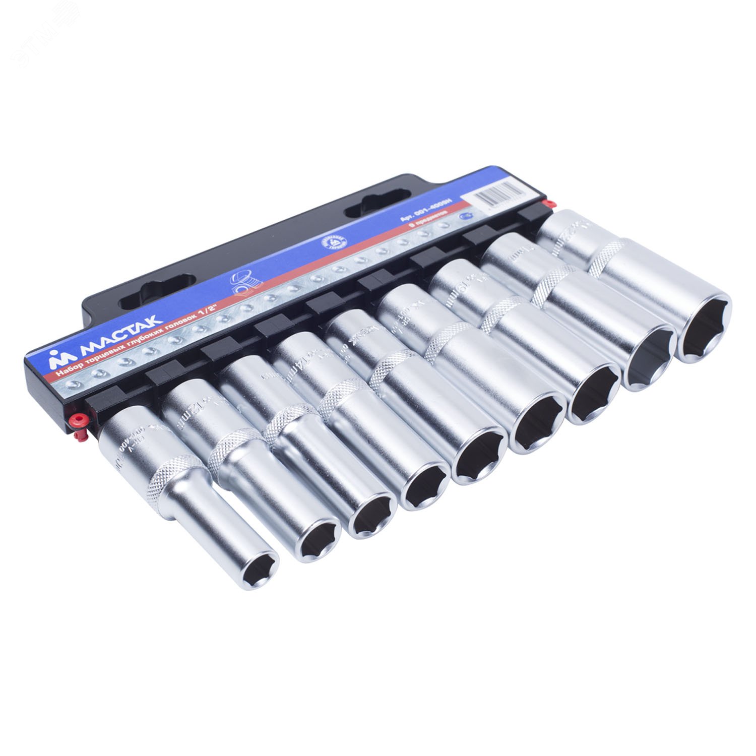 Торцевые головки из данного набора. Применяются для передачи крутящего момента от инструмента на крепеж для его быстрого откручивания или закручивания, подходит для монтажа/демонтажа глубоко посаженных гаек и болтов. На станциях технического обслуживания автомобилей (СТОА), в автосервисах и автомастерских. Головка изготовлена из инструментальной легированной хром-ванадиевой стали специального сплава. Технология изготовления головок марки включает в себя метод горячей ковки с последующей термообработкой, придающий инструментам особую прочность и высокую надежность. Хромированное покрытие защищает инструменты от коррозии. Специальная насечка на ободке головки исключает проскальзывание ее в руке оператора при работе.