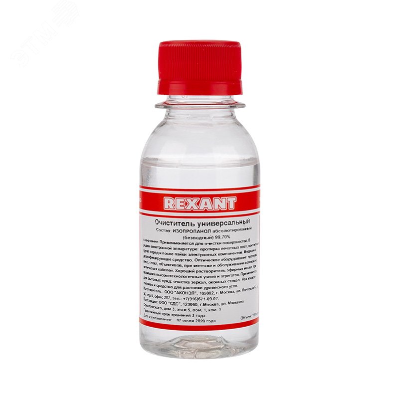 Очиститель универсальный 100 мл REXANT предназначен для ''мягкой'' очистки или обезжиривания различных предметов. Применяется для очистки радиоэлектронных элементов (печатные платы, контакты реле и прочие), очистки оптического оборудования (линзы стекла, объективы), бытовых нужд (чистка зеркал, оконных стекол, хрусталя, как жидкое топливо в спиртовках и зажигалках, растопка древесного угля), в автомобильном деле (очистка и удаление влаги из бензобака автомобиля, антизамораживатель стеклоомывающей жидкости при минусовых температурах), при монтаже и обслуживании волоконно-оптических кабелей (ВОЛС), обслуживания аудио– и видеооборудования и других целей. Представляет собой бесцветную прозрачную жидкость без механических примесей с характерным запахом.