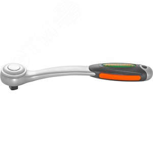 Трещоточная рукоятка с изогнутой ручкой и дисковым переключателем направления вращения обеспечивает очень маленький 5 град. обратный ход благодаря конструкции храпового механизма. Изогнутая форма ручки позволяет использовать изделие при обслуживании заглубленного крепежа без опаски повреждения руки оператора. Трехкомпонентная резинополимерная рукоятка обеспечивает надежное удержание инструмента. К особенностям эксплуатации можно отнести необходимость достаточно частого обслуживания, чистых рук пользователя и свободной от загрязнений рабочей зоны. Применяются при производстве работ со слабонагруженными резьбовыми соединениями. Не имеют альтернативы (за исключением трещоточных ключей) при использовании в ограниченных рабочих пространствах.