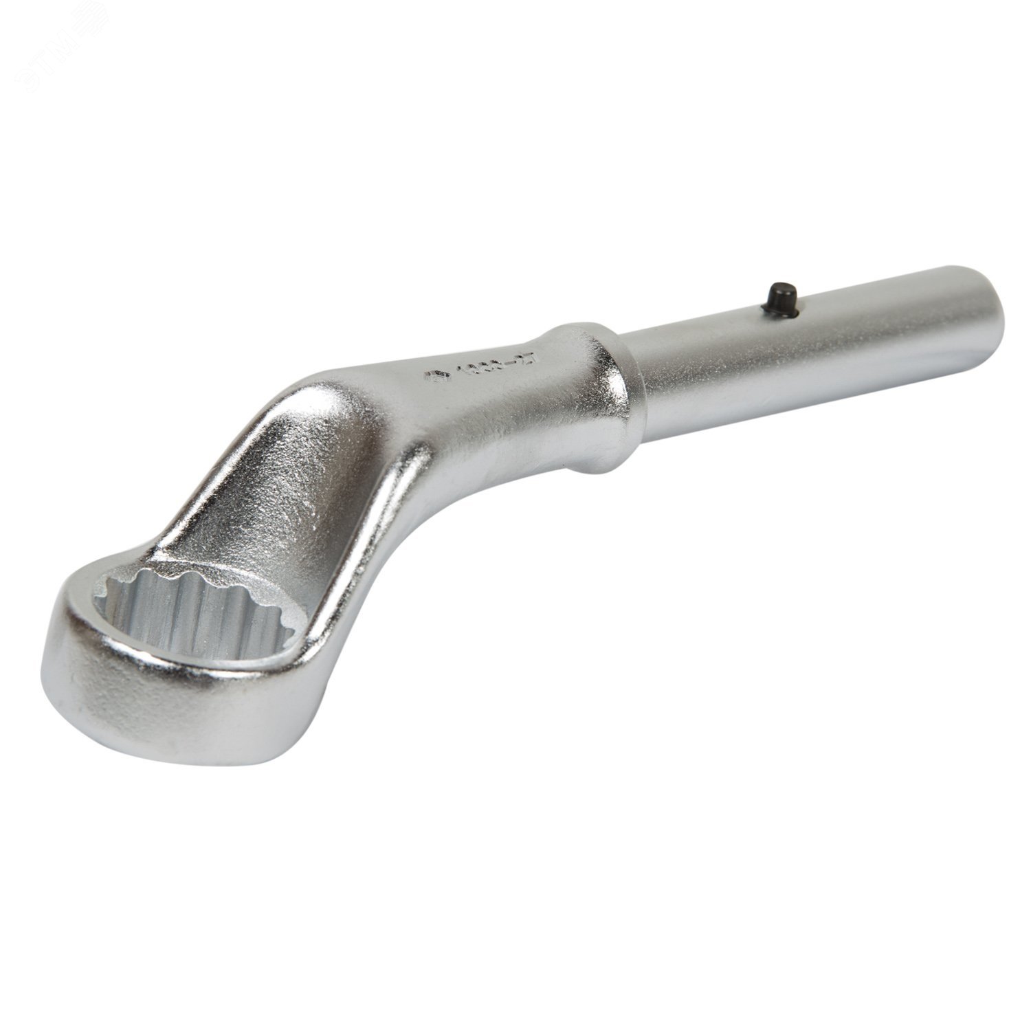 Работа с крепежом конструкций и техникой промышленного масштаба. Область применения - Ремонт и обслуживание крупногабаритной техники и конструкций, промышленность, сельское хозяйство, производство, строительство, станции технического обслуживания автомобильной и другой техники. Использовать ключ в тяжелых условиях под действием больших нагрузок. Особенности - Для использования совместно с рычагом-трубой арт. 112261 Накидной профиль прямого действия - работа в местах, где другие форматы ключей не подходят. Специальный изгиб ключа позволяет работать в местах с ограниченным доступом к крепежу. 12-тигранный профиль накидной части универсален в работе с головками болтов или гайками как 6- ти, так и 12-тигранного профиля.
