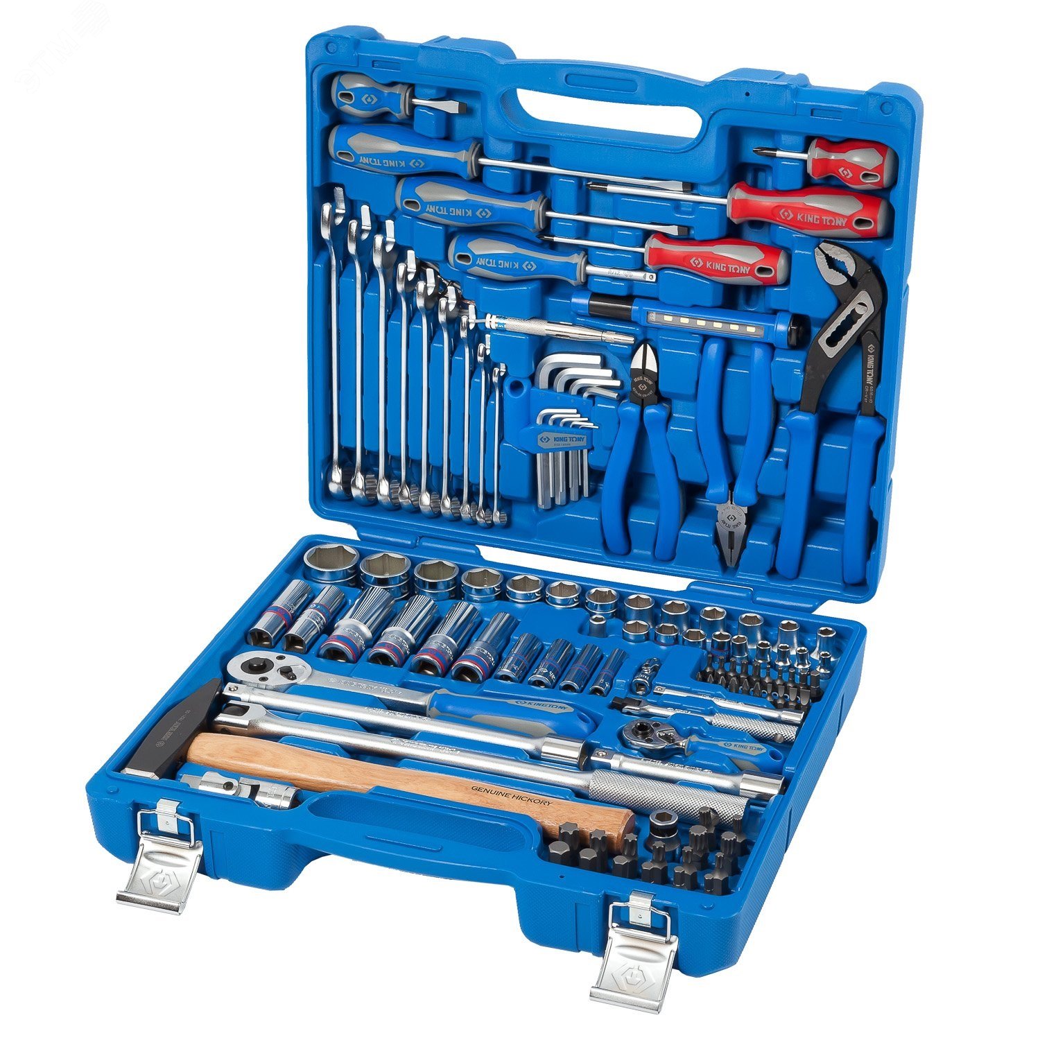 Новый набор торговой марки KING TONY в линейке универсальных наборов. Головки и принадлежности 2-х форматов присоединительного квадрата - 1/2' и 1/4'. Широкий ряд размеров стандартных торцевых головок. Головки форматов 1/2' и 1/4', Трещотка 276A-04G формата 1/4' - может работать как с головками, так и со вставками (битами) без переходника. В составе набора светодиодный фонарик KING TONY серии 79831 с креплением 'клипса+магнит'. Молоток - немецкий тип, рукоятка породы дерева GenuineHickory (канадский орешник), металлические замки - тип фиксатора CLIP-LOCK.