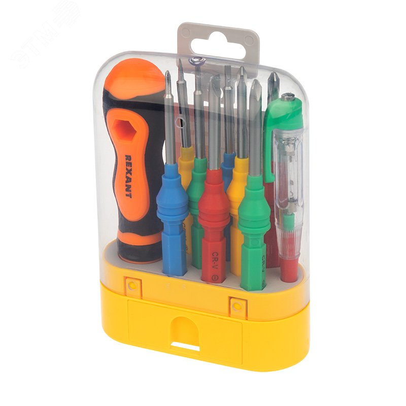Набор отверток REXANT 10 в 1 предназначен для выполнения монтажных и демонтажных работ с резьбовыми соединениями - шурупами, саморезами и т. д. Инструменты выполнены из качественной хромованадиевой стали. Двухкомпонентная рукоятка оснащена магнитным держателем, что обеспечивает быструю замену и надежную фиксацию бит. В основании инструмента предусмотрено шестигранное отверстие. Если установить в него одну из насадок, то можно получить дополнительный рычаг усилия при работе. Набор укомплектован тестером-пробником - предназначен для быстрой и эффективной диагностики электрооборудования (домашних приборов, ламп накаливания, предохранителей). Для удобства хранения и транспортировки все инструменты поставляются в пластиковом футляре.