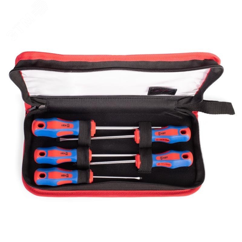 Состав набора - отвертка - шлиц 3 х 75, отвертка - шлиц 4 х 100, отвертка - шлиц 5.5 х 125, отвертка - PH 1 х 100, отвертка - PH 2 х 125, отвертка - шлиц 3 х 75, отвертка - шлиц 4 х 100, отвертка - шлиц 5.5 х 125, отвертка - PH 1 х 100, отвертка - PH 2 х 125. Для слесарно-монтажных работ. Анатомическая двухкомпонентная рукоятка с выемками под пальцы для удобства работы. Специальная форма рукоятки, не позволяющая инструменту скатываться с наклонной поверхности. Маркировка на торце рукояток с обозначением типа профилей. Отверстие в рукоятке для удобства хранения. Материал стержня - хром-ванадиевая сталь. Вороненый наконечник. Удобные и функциональные кофры для хранения наборов НО-05 (КВТ), НО-08(КВТ) и НО-05 TORX (КВТ). Упаковка - кофр с прозрачной крышкой