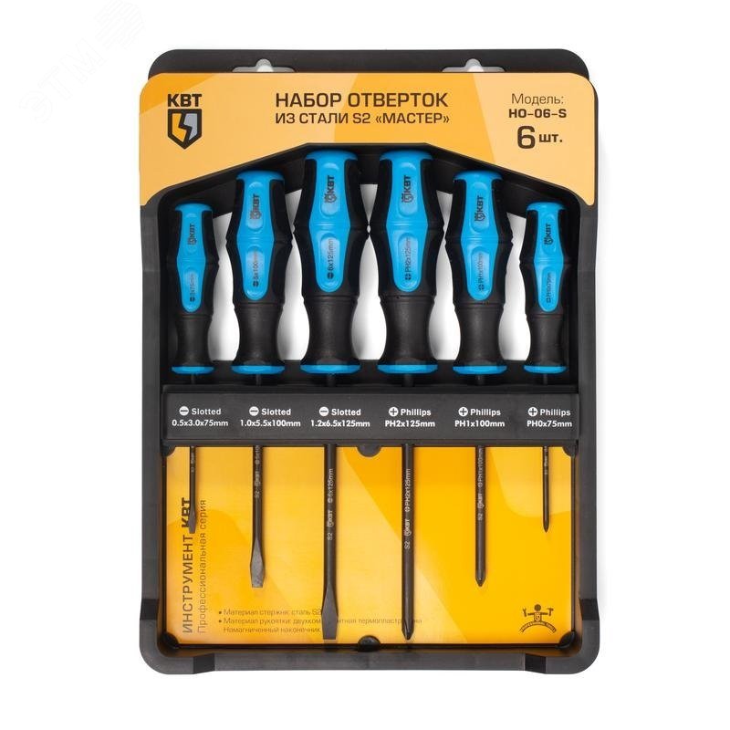 Состав набора - отвертка - шлиц 3х75, отвертка - шлиц 5.0х100, отвертка - шлиц 6.0х125, отвертка - PH0х75, отвертка - PH1х100, отвертка - PH2х125, отвертка - шлиц 3х75, отвертка - шлиц 5.0х100, отвертка - шлиц 6.0х125, отвертка - PH0х75, отвертка - PH1х100, отвертка - PH2х125. Намагниченный вороненый наконечник. Стержни из высококачественной инструментальной легированной стали S2. Покрытие стержня - черное фосфатирование. Двухкомпонентная рукоятка с мягкими прорезиненными вставками. Маркировка на торце рукояток с обозначением типа профилей. Специальная форма рукоятки, не позволяющая инструменту скатываться с наклонной поверхности. Упаковка - блистер