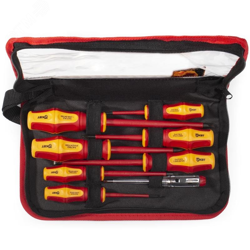 Состав набора - Отвертка диэлектрическая шлиц 2.5х75, отвертка диэлектрическая шлиц 4.0х100, отвертка диэлектрическая шлиц 5.5х125, отвертка диэлектрическая шлиц 6.5х150, отвертка диэлектрическая РН0х60, отвертка диэлектрическая PH1х80, отвертка диэлектрическая PH2х80, отвертка индикаторная. Для работ под напряжением до 1000 В. Двухкомпонентные эргономичные рукоятки с мягкими прорезиненными вставками. Маркировка на торце рукояток с обозначением типа профилей. Специальная форма рукояток, не позволяющая инструменту скатываться с наклонной поверхности. Стержни из высокопрочной стали S2. Намагниченные наконечники. Упаковка - кофр на молнии с прозрачной крышкой. Вес набора - 576 г