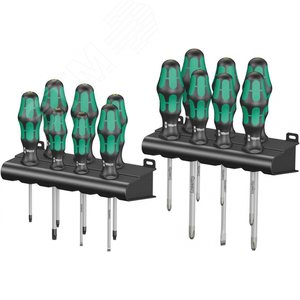 Универсальный набор отверток, которые требуются профессионалу. Ручка Kraftform Plus для комфортной работы без появления на руках мозолей и волдырей. Твердые зоны ручки для высокой скорости работы, в то время как мягкие зоны ручки обеспечивают передачу больших моментов силы. Наконечник Lasertip с профилем шлиц, Phillips и Pozidriv надёжно вгрызается в головку винта и предотвращает выскальзывание отвёртки. С индикаторами инструментов ''Take it easy'' - Цветовая маркировка профиля и гравировка размера. Шестигранный край ручки предотвращает надоедливое перекатывание отвёртки на рабочем месте.