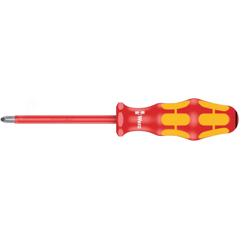 Отвёртка Wera VDE с многокомпонентной ручкой Kraftform Plus для работы в быстром и щадящем режиме - твердые зоны ручки для высокой скорости работы, в то время как мягкие зоны ручки обеспечивают передачу больших моментов силы. Поштучная проверка в водяной бане под напряжением 10000 В для безопасной работы на оборудовании с максимально допустимым напряжением 1000 В. Идентификаторы инструментов ''Take it easy'' с цветовой кодировкой профиля и гравировкой размера - для простого и быстрого отбора требуемого инструмента. Шестигранный край ручки для защиты от перекатывания отвёртки на рабочем месте.