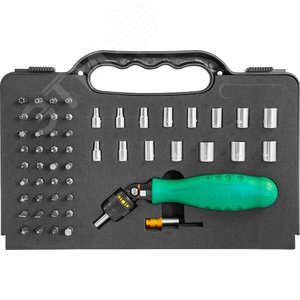 Рукоятка отверточная трещоточная с гибкой головкой в наборе с битами и головками, 53 предмета