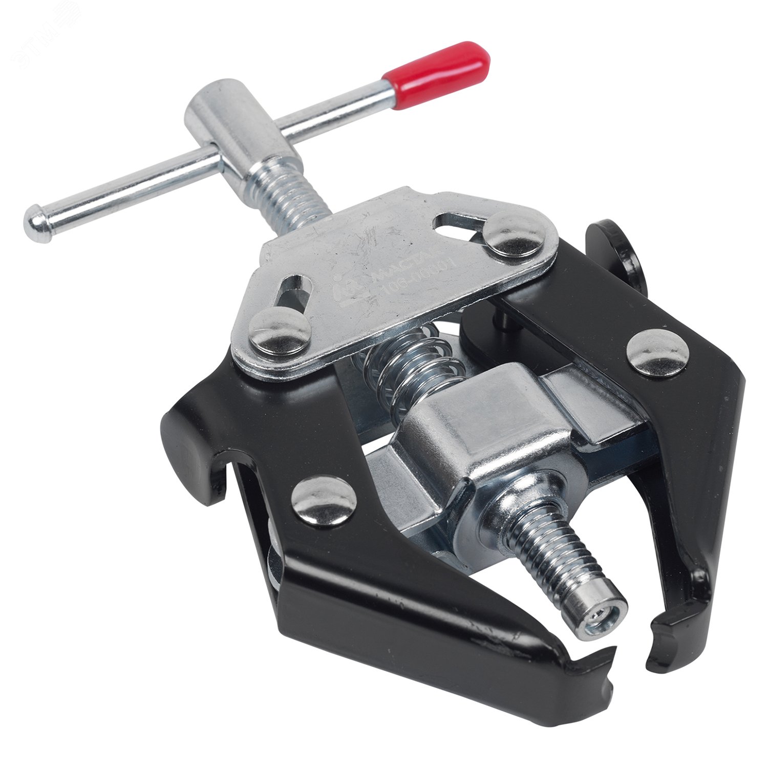 Демонтаж аккумуляторных клемм без повреждения корпуса аккумулятора. Применяется на станциях технического обслуживания автомобилей (СТО), автосервисах, автомастерских, в промышленности. Особенность конструкции съемника в том, что вам не придется заранее регулировать ширину захвата лап, достаточно просто разжать лапы (притом одной рукой), установить съемник на деталь, и отпустить – подпружиненная конструкция и двойной шарнир зафиксируют. Зажимные лапы так, как надо и максимально плотно, а центральный силовой винт сделает свою работу аккуратно и быстро. Съемник может применяться для демонтажа небольших подшипников, к примеру, подшипников генератора, а также поводков стеклоочистителя там, где позволяет конструкция автомобиля. Центральный винтовой шарнир повышает эффективность в работе