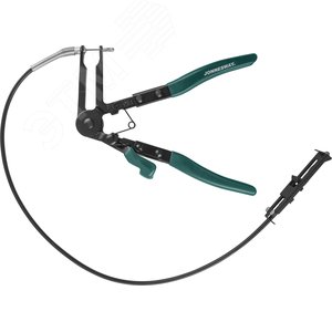 Специальный инструмент с зажимом, установленным на гибком тросе, длиной 700 мм, позволяющим использовать изделие для снятия плоских пружинных хомутов систем охлаждения в крайне осложненных и скрытых местах подкапотного пространства. Приспособление идеально подходе при обслуживании автомобилей группы VAG и PORSCHE. Рукоятки инструмента снабжены фиксатором положения зажима, освобождающим оператора от необходимости постоянно их удерживать. Изделие изготовлено из стали, имеет защитное покрытие - фосфатирование и обливные ПХВ чехлы рукояток.