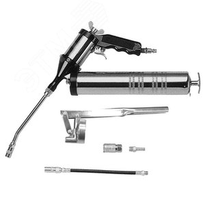 Нагнетатель консистентных смазок для работы в труднодоступных местах, с резервуаром, емкостью 400, применяется при производстве работ по техническому и регламентному обслуживанию узлов и агрегатов техники, имеющих точки смазки, снабженные пресс-масленками первого и второго типа всех номеров. Инструмент имеет узел, позволяющий перемещать резервуар относительно рукоятки на 360 град. Изделие поставляется в комплекте с дополнительными приспособлениями и, в случае отсутствия возможности подключения инструмента к воздушной магистрали - ручной рычажный привод. Пневматический смазочный шприц подает смазку в автоматическом режиме. При нажатии на клавишу куркового механизма начинается постоянная подача смазки, порционно в автоматическом режиме.