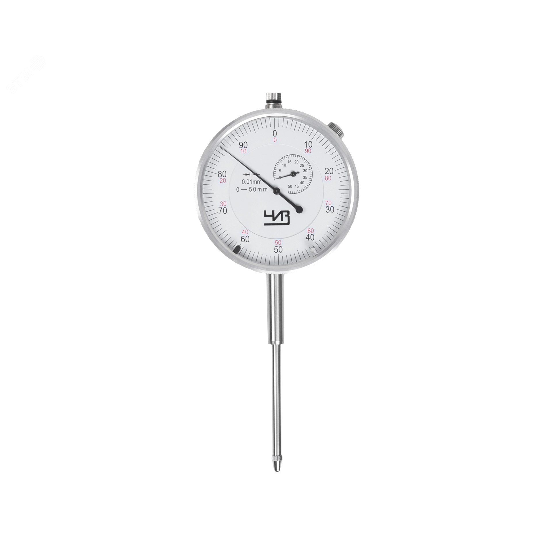 Внесен в госреестр. Регистрационный № 40149-08. ГОСТ 577-68. Это многофункциональный инструмент, применяемый для измерения, а также для выявлений отклонений размеров деталей в серийном производстве. Кроме того, индикаторы применяются для проверки биения зубчатых колес, шкивов, шпинделей и других вращающихся деталей. Действие прибора основано на работе реечно-зубчатой и шестеренной передачи. Часовой индикатор состоит из корпуса, в котором через всю длинную втулку проходит измерительный стержень с зубчатой рейкой. Измерительной поверхностью является измерительный наконечник с запрессованным в него шариком. Индикатор типа ИЧ обладает стержнем, который перемещается параллельно шкале. Индикатор используется совместно с крепежным оборудованием, таким как стойки и штативы. Шкала индикатора имеет цену деления 0.01 мм. Диапазон измерений 0- 10 мм. Без крепежного ушка.