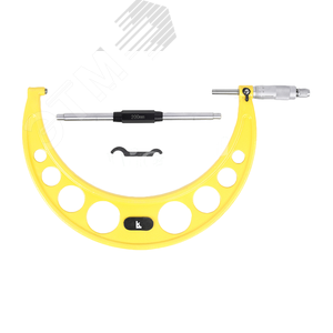 Микрометр МК- 200 0,01 желт. скоба КЛБ — средство для измерения наружных линейных размеров. Основанием микрометра является скоба, а преобразующим устройством служит винтовая пара, состоящая из микрометрического винта и микрометрической гайки, укреплённой внутри стебля их часто называют микропарой. В скобу запрессованы пятка и стебель. Измеряемую деталь охватывают торцевыми измерительными поверхностями микровинта и пятки. Барабан присоединён к микровинту с помощью колпачка в котором находится корпус трещотки. Чтобы приблизить микровинт к пятке, вращают барабан трещотку по часовой стрелке (от себя), а для обратного движения микровинта (от пятки) барабан вращают против часовой стрелки (на себя). Закрепляют микровинт в требуемом положении стопором. Верхний предел измерений 200 мм. Цена деления шкалы барабана 0,01 мм. Производство бренда Калиброн.