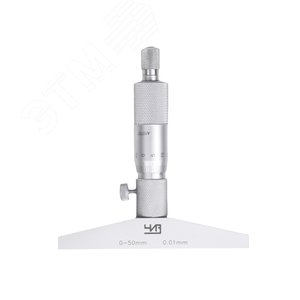 Глубиномер микрометр. ГМ- 50 0,01 ЧИЗ - предназначен для измерения глубины пазов и высоты уступов до 300 мм. Состоит он из микрометрической головки, стебля, основания и наконечника, покрытого твердым сплавом. Микрометрическая головка аналогична барабану микрометра. Считывают размеры при пользовании этим инструментом так же, как и при замерах микрометром. Цифры у штрихов стебля и барабана нанесены в обратном порядке по сравнению с микрометрами, так как чем больше глубина, тем дальше выдвинут микровинт. Материал изготовления - углеродистая или нержавеющая сталь. Хранить прибор следует в специальном пластиковом или деревянном кейсе, который поставляется в наборе. Глубиномеры должны эксплуатироваться при температуре 20+-15 градусов С и относительной влажности воздуха не более 80% при температуре 25 градусов С. Имеет верхний предел измерения 50 мм, с ценой деления 0,01 мм. Производство бренда ЧИЗ.