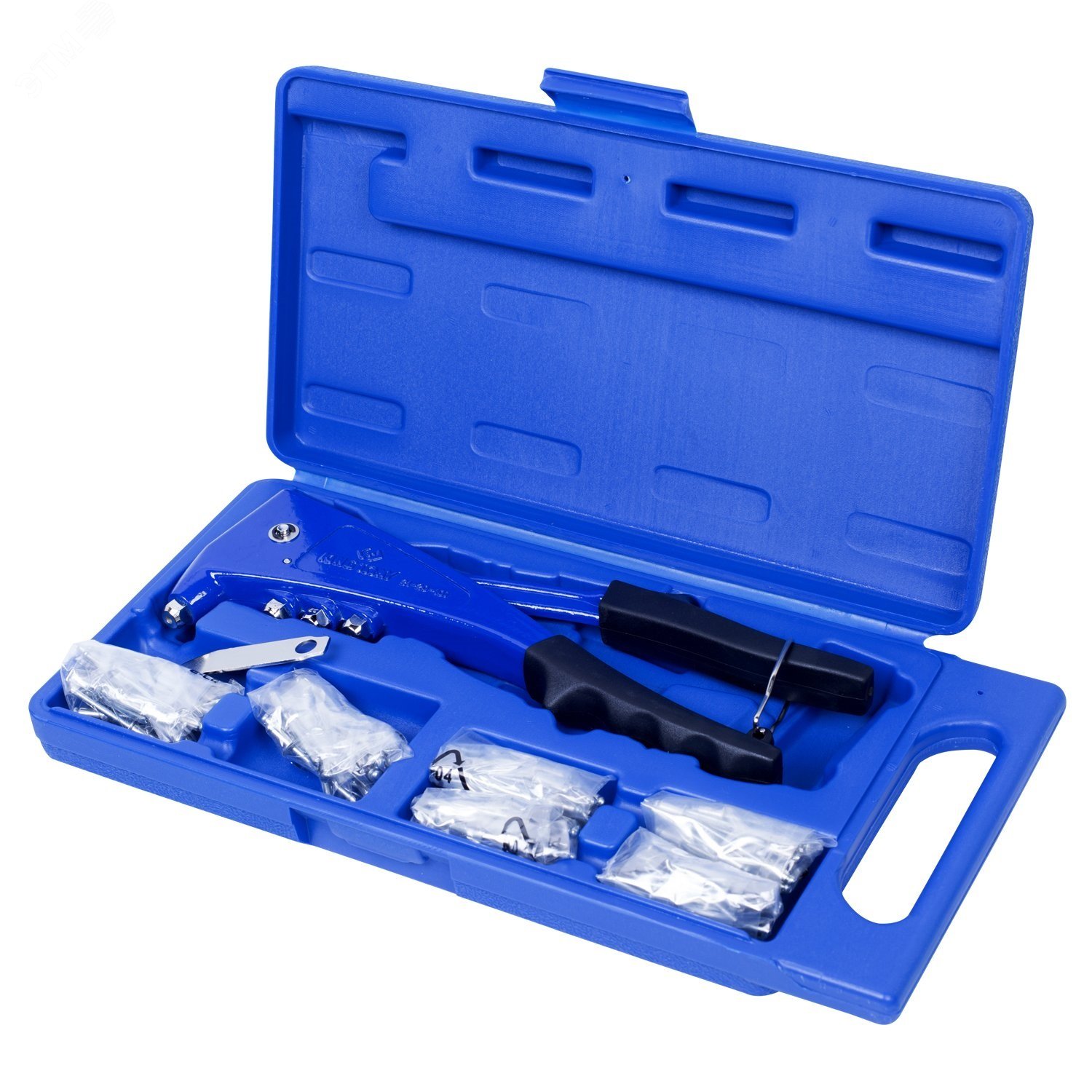 Заклепочник с набором заклепок, 121 предмет KING TONY 21-20-07MR. Заклепочник предназначен для соединения листового металла, деталей конструкций, а также для выполнения монтажных работ различного характера. В качестве соединительных элементов применяются специальные заклепки вытяжного типа. Заклепочник оснащен зажимными губками из твердосплавной стали, адаптерами для заклепок разного диаметра, специальным ключом, эргономичными рукоятками из резинопластика. Заклепочник с комплектом заклепок расположен в кейсе, удобном для хранения либо транспортировки, а также поможет сохранить комплектующие набора от утери. Технические характеристики . Диаметр применяемых заклепок - от 2,4 до 4,8 мм