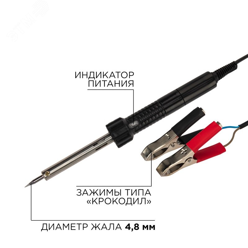 Паяльник с 2 зажимами ''крокодил'' в комплекте применяется для ручного монтажа радиоэлементов. Паяльник с ''крокодилами'' очень удобен, если есть необходимость пайки в подкапотном пространстве, а также на улице или в гараже при отсутствии розетки 220 В. Подключается к аккумулятору автомобиля. В корпус ручки паяльника встроен LED индикатор состояния нагрева. Удобная эргономичная рукоятка выполнена из термостойкого пластика. Напряжение питания - 12 В. Потребляемая мощность - 40 Вт. Рабочая температура жала - 410 градусов. Время разогрева до рабочей температуры - 8 мин. Тип жала - конус. Диаметр жала - 4.8 мм. Длина провода - 1.35 м.