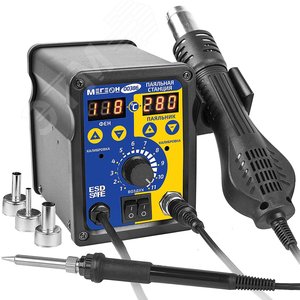 МЕГЕОН 00386 - надёжная и очень удобная паяльная станция 2 в 1, состоящая из термофен с центробежным нагнетателем и паяльника. Прибор получил компактные размеры блока управления и небольшой вес. Благодаря размещению вентилятора в рукоятке фена исключены вибрации и снижен уровень шума, возникающие при работе с подобным оборудованием, но со встроенным пневмокомпрессором. Для изготовления корпуса электрофена был применён специальный термостойкий пластик с антистатическим эффектом. Паяльник имеет конструкцию распространённого типоразмера жал, в который входит более 20-ти типов наконечников для выполнения самых разнообразных задач. Цифровые установка и контроль температуры обоих инструментов позволили достичь максимального удобства при эксплуатации, а интеллектуальное охлаждение нагревателя потока воздуха продлит его срок службы.
