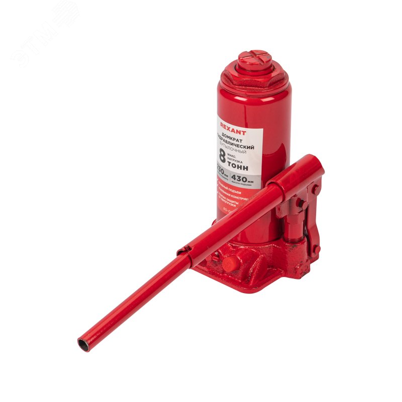 Гидравлический бутылочный домкрат 8 т Rexant поднимает грузы массой до 8 тонн на высоту до 457 мм. Оптимален для автомобилей с большим клиренсом. Будет полезен автолюбителям при проведении технического обслуживания и ремонта, а также для профессионалов на СТО. Отличается плавностью хода, надежностью и жесткостью конструкции. Клапан безопасности не дает поднимать груз тяжелее 8 т, предохраняя домкрат от поломки. Максимальная нагрузка - 8 т. Высота подхвата - 230 мм. Высота подъема - 430 мм. Материал корпуса - сталь, чугун.