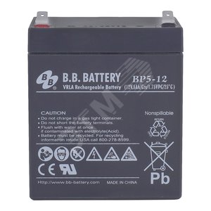 Необслуживаемые аккумуляторные батареи BB BATTERY BP5-12 емкостью 5 Ач и напряжением 12 В работают как в циклическом так и в режиме постоянного заряда. Спектр применения батарей линейки BP - от аварийного освещения и электроснабжения, медицинского оборудования, источников бесперебойного питания до фонарей и детских игрушек. Герметичный корпус выполнен из неокисляемого теплостойкого ABS пластика. Технология AGM (электролит, абсорбированный в стекловолокне) позволяет избежать выделения свободного кислорода и водорода, что делает эксплуатацию аккумуляторов B B BATTERY BP5-12 безопасной и увеличивает сроки их использования - до 10 лет.