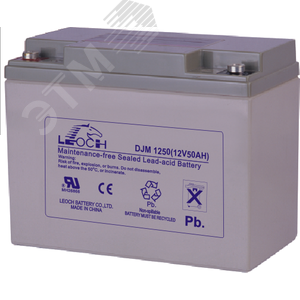 Свинцово-кислотный аккумулятор Leoch DJM 1250 с ёмкостью 50 Ач, напряжением 12 В может эксплуатироваться в циклическом (260 циклов при глубине разряда 30%) и буферном (до 12 лет) режимах. Материал корпуса — прочный неокисляемый ABS-пластик, на крышке располагается клапан избыточного давления. Leoch DJM1250 создан с использованием стекловолоконных сепараторов, они удерживают электролит неподвижно. Рекомбинация газов происходит внутри корпуса изделия, это исключает возможность протечки электролита и делает аккумулятор необслуживаемым.