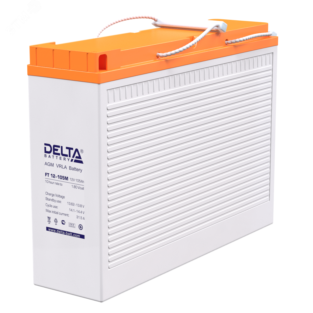 Герметизированный VRLA cвинцово-кислотный аккумулятор Delta FT 12-105 M напряжением 12В и емкостью 105Ач изготовлен по технологии AGM (с микропористым заполнителем, пропитанным электролитом). Конструкция оптимизирована для установки в 19'' и 23'' шкафы и стойки. Изготовлен из негорючего ABS пластика. Срок службы аккумулятора достигает 10-12 лет. Аккумулятор предназначен для работы в режиме постоянного подзаряда (буферный режим) или в режиме разряд-заряд (циклический режим). Обладает низким внутренним сопротивлением и саморазрядом.