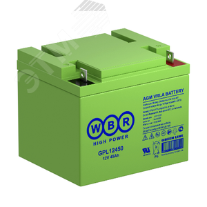 Аккумуляторная батарея WBR серии GPL 12450 - герметизированные, выполненные по технологии AGM, свинцово-кислотные аккумуляторные батареи общего применения со сроком службы 12 лет в буферном режиме или 260 циклов заряда-разряда в циклическом режиме при 100% разряде. Эти высокоэффективные перезаряжаемые батареи не требуют обслуживания в течение всего срока службы.