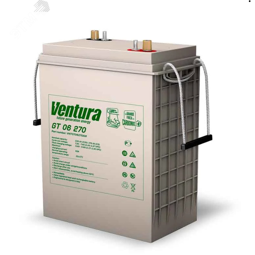 Свинцово-кислотный тяговый аккумулятор VENTURA GT 06 270 (емкость 270 Ач (C5), напряжение 6 вольт) разработан с применением технологии AGM. Она обеспечивает больший срок службы (до 600 циклов при DOD 80%), быструю подзарядку и повышенную температурную устойчивость. Корпус выполнен из прочного ABS пластика и усилен ребрами жесткости. Конструкция полностью герметична и не требует обслуживания, это достигается благодаря наличию одностороннего клапана избыточного давления (VRLA). Тяговый аккумулятор VENTURA GT 06 270подходит для электромоторов лодок, катеров, погрузучно-разгрузочной, полоуборочной и другой электротяговой техники.