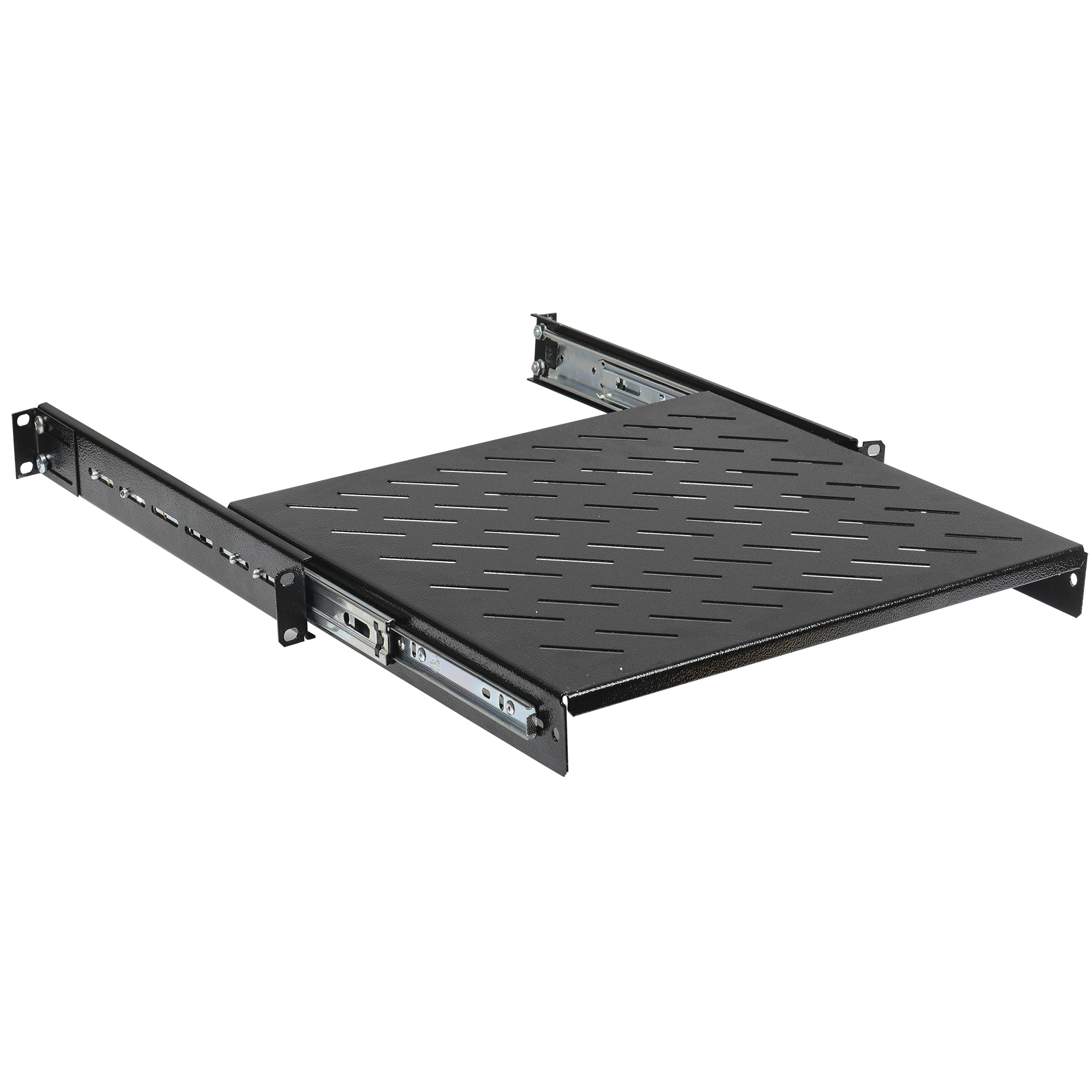 Выдвижные полки крепятся на фронтальные и на задние профили, имеют перфорированную поверхность для обеспечения лучшего охлаждения и отведения теплых воздушных потоков, а за счёт наличия специальных телескопических салазок способны плавно выдвигаться вперед за пределы рабочей плоскости, образованной передней парой 19'' профилей. Данные полки рассчитаны на оборудование, требующее регулярного обслуживания и извлечения из шкафа, но с небольшой общей массой, чтобы избежать его опрокидывание и возможной поломки выдвижного механизма полки.