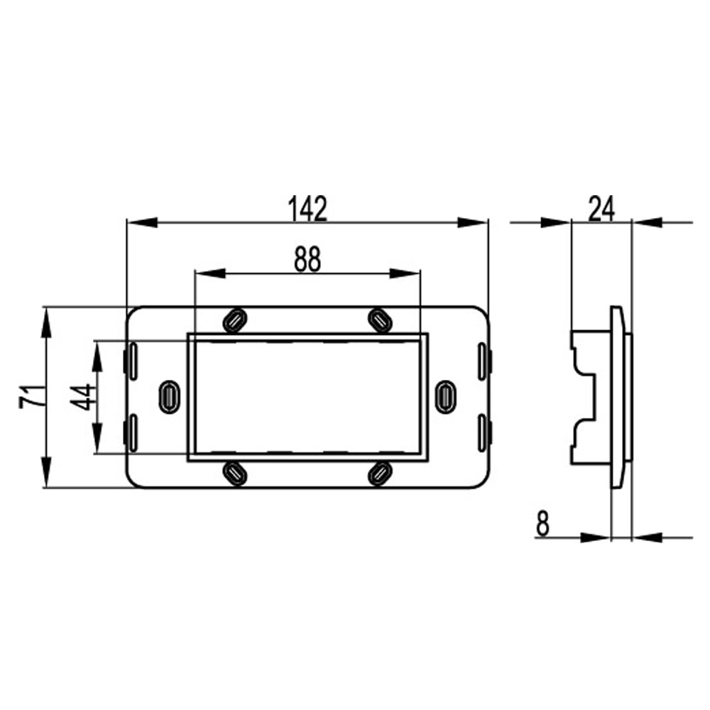 Каркас для монтажа ЭУИ "Brava" в стены и коробки PDD-N60. Назначение: монтаж ЭУИ "Brava". Характеристики: соединения 2-х и более каркасов между собой, имеются специальные выступы и пазы; ЭУИ "Brava" защелкиваются в каркасы изнутри (с задней стороны); Требования к коробке: диаметр встраиваемой коробки должен быть 65-68 мм, глубина от 40 мм и более, межосевое расстояние (при монтаже 2-х и более коробок) − 71 мм. Кол-во модулей: 4. Цвет: белый