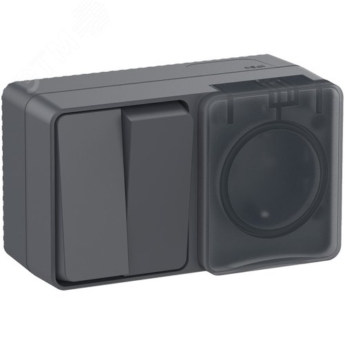 AtlasDesign Profi54 БЛОК: розетка с заземлением со шторками 16А 250B, выключатель двухклавишный IP54 10А, АНТРАЦИТ, Россия