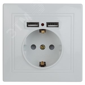 Розетка Intro Plano 1-410-01 с заземлением 2P+E Schuko со шторками, 16А-250В + 2хUSB 5В-2,1А, IP20, СУ, белый