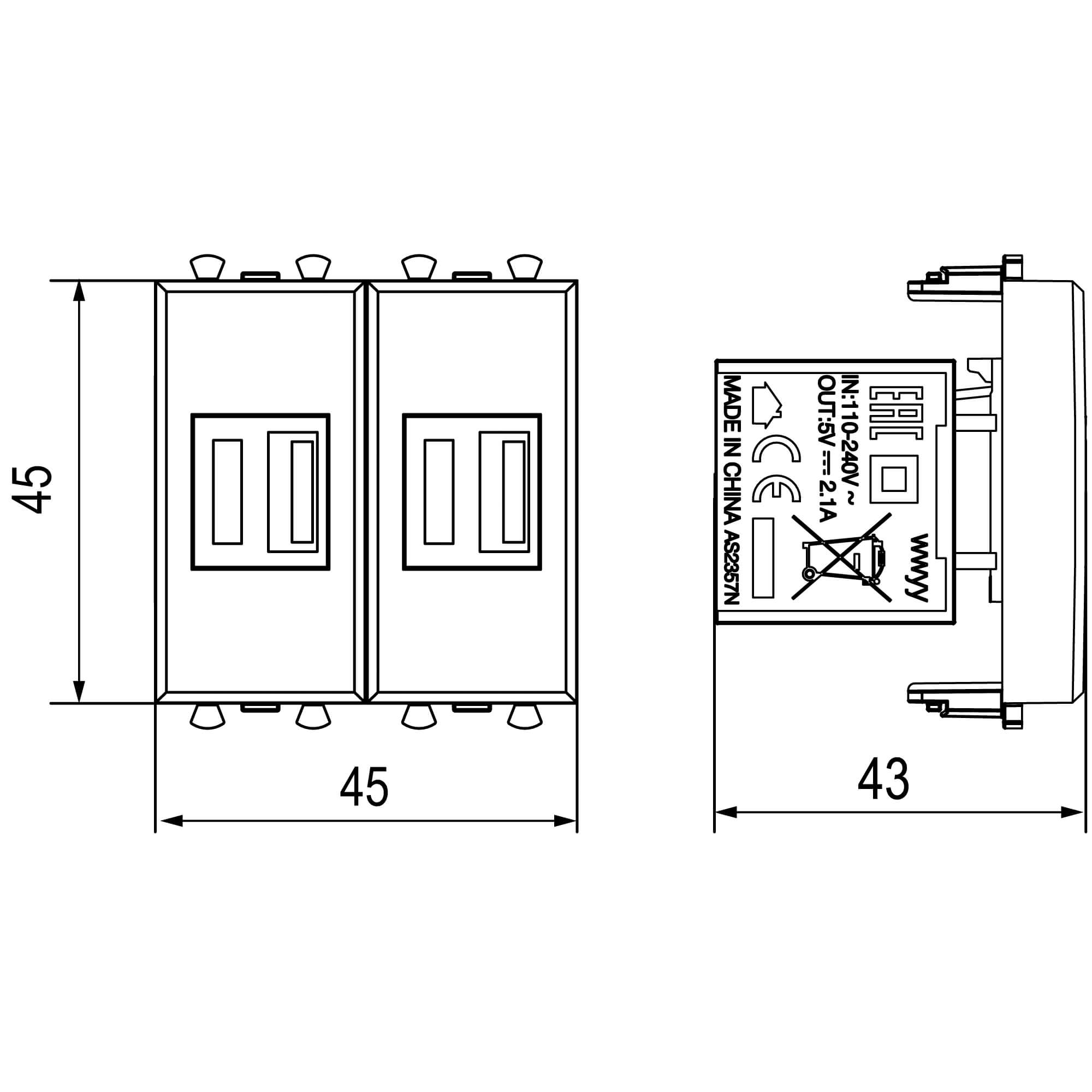 USB зарядное устройство модульное. Назначение: для монтажа в систему кабельных коробов "In-liner Front" и систему организации рабочих мест "Sotto" (алюминиевые кабель-каналы, колонны, башенки и лючки) при помощи рамок-суппортов и каркасов "Avanti" (код 4400912 и т.д.); используется для подзарядки электронных гаджетов. Характеристики: винтовые зажимы; номинальное напряжение – 220 В; частота – 50–60 Гц; напряжение на выходе – 5 В; фиксация в подрозеточные коробки глубиной не менее 45 мм при помощи каркаса с лапками (код 4400802) и саморезов. Кол-во модулей: 2. Цвет: "Закаленная сталь". Производитель оставляет за собой право вносить во внешний вид изделия изменения, которые не влияют на его функционал, безопасность и надежность.