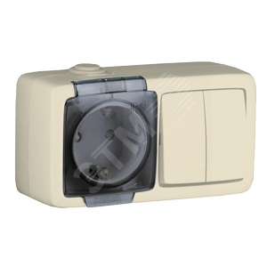 Alfa Блок с пылевлагозащитой, розетка одноместная, со шторками, с заземляющими контактами, выключатель двухклавишный, слоновая кость