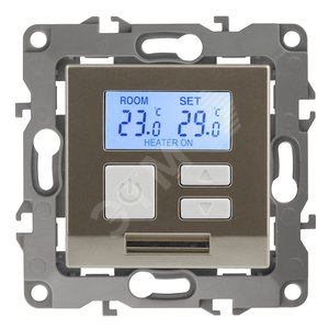 Терморегулятор теплый пол / отопление электронный серии Эра 12 СУ механизм цвет шампань 12-4111-04. Номинальные характеристики 16А 230В. Сделана из поликарбоната. Монтаж в подрозетник производится и на лапки, и на винты. Рамки приобретаются отдельно. Рамки Эра 12: 1 пост 12-5001-хх, 2 поста 12-5002-хх, 3 поста 12-5003-хх, 4 поста 12-5004-хх, 5 постов 12-5005-хх. Рамки Эра 12 Сатин: 1 пост 12-5101-хх, 2 поста 12-5102-хх, 3 поста 12-5103-хх, 4 поста 12-5104-хх, 5 постов - 12-5105-хх (хх - код цвета: 01-белый, 02-слоновая кость, 03-алюминий, 04-шампань, 05-антрацит, 06-чёрный, 07-ольха(белёный дуб-сатин), 08-вишня, 09-дуб, 10-венге, 11-сосна, 21-жёлтый, 22-оранжевый, 23-красный, 24-охра, 25-бордо, 26-лайм, 27-зелёный, 28-голубой, 29-синий).
