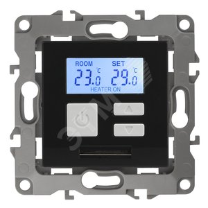 Терморегулятор теплый пол / отопление электронный серии Эра 12 СУ механизм цвет антрацит 12-4111-05. Номинальные характеристики 16А 230В. Сделана из поликарбоната. Монтаж в подрозетник производится и на лапки, и на винты. Рамки приобретаются отдельно. Рамки Эра 12: 1 пост 12-5001-хх, 2 поста 12-5002-хх, 3 поста 12-5003-хх, 4 поста 12-5004-хх, 5 постов 12-5005-хх. Рамки Эра 12 Сатин: 1 пост 12-5101-хх, 2 поста 12-5102-хх, 3 поста 12-5103-хх, 4 поста 12-5104-хх, 5 постов - 12-5105-хх (хх - код цвета: 01-белый, 02-слоновая кость, 03-алюминий, 04-шампань, 05-антрацит, 06-чёрный, 07-ольха(белёный дуб-сатин), 08-вишня, 09-дуб, 10-венге, 11-сосна, 21-жёлтый, 22-оранжевый, 23-красный, 24-охра, 25-бордо, 26-лайм, 27-зелёный, 28-голубой, 29-синий).