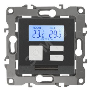 Терморегулятор теплый пол / отопление электронный серии Эра 12 СУ механизм цвет графит 12-4111-12. Номинальные характеристики 16А 230В. Сделана из поликарбоната. Монтаж в подрозетник производится и на лапки, и на винты. Рамки приобретаются отдельно. Рамки Эра 12: 1 пост 12-5001-хх, 2 поста 12-5002-хх, 3 поста 12-5003-хх, 4 поста 12-5004-хх, 5 постов 12-5005-хх. Рамки Эра 12 Сатин: 1 пост 12-5101-хх, 2 поста 12-5102-хх, 3 поста 12-5103-хх, 4 поста 12-5104-хх, 5 постов - 12-5105-хх (хх - код цвета: 01-белый, 02-слоновая кость, 03-алюминий, 04-шампань, 05-антрацит, 06-чёрный, 07-ольха(белёный дуб-сатин), 08-вишня, 09-дуб, 10-венге, 11-сосна, 21-жёлтый, 22-оранжевый, 23-красный, 24-охра, 25-бордо, 26-лайм, 27-зелёный, 28-голубой, 29-синий).