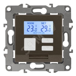 Терморегулятор теплый пол / отопление электронный серии Эра 12 СУ механизм цвет бронза 12-4111-13. Номинальные характеристики 16А 230В. Сделана из поликарбоната. Монтаж в подрозетник производится и на лапки, и на винты. Рамки приобретаются отдельно. Рамки Эра 12: 1 пост 12-5001-хх, 2 поста 12-5002-хх, 3 поста 12-5003-хх, 4 поста 12-5004-хх, 5 постов 12-5005-хх. Рамки Эра 12 Сатин: 1 пост 12-5101-хх, 2 поста 12-5102-хх, 3 поста 12-5103-хх, 4 поста 12-5104-хх, 5 постов - 12-5105-хх (хх - код цвета: 01-белый, 02-слоновая кость, 03-алюминий, 04-шампань, 05-антрацит, 06-чёрный, 07-ольха(белёный дуб-сатин), 08-вишня, 09-дуб, 10-венге, 11-сосна, 21-жёлтый, 22-оранжевый, 23-красный, 24-охра, 25-бордо, 26-лайм, 27-зелёный, 28-голубой, 29-синий).
