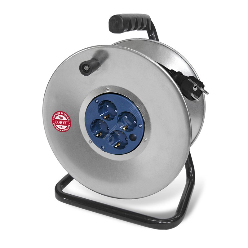 Удлинитель силовой ТМ Союз на металлической катушке 4 гнезда с защиткой крышкой 3700Вт ПВС 30м